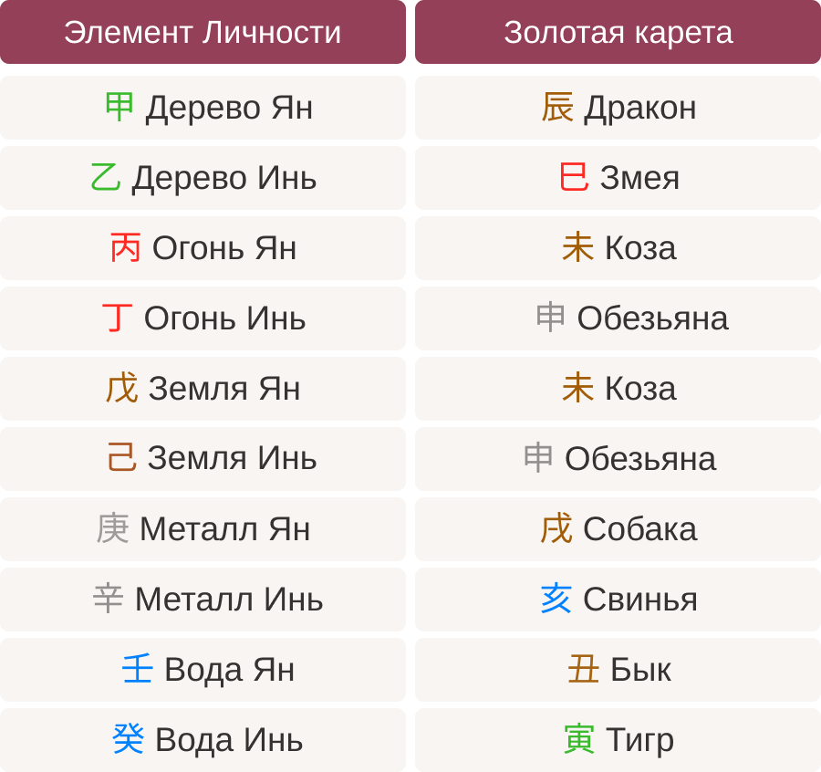 Чтобы найти свою Золотую Карету, определите элемент личности и найдите соответствующее животное в таблице: